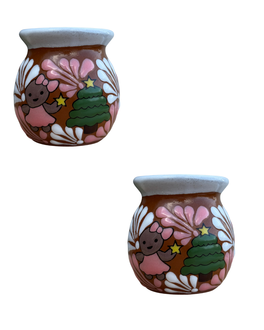 ¡Trae alegría festiva a tu cocina con este encantador juego de dos Jarritos con diseños navideños cautivadores! Cada taza de cerámica exhibe la auténtica artesanía mexicana con una niña de pan de jengibre caprichosa y un árbol de Navidad pintados en tonos café cálido y blanco nítido. Perfectas para saborear chocolate caliente, café o tu bebida estacional favorita, estas piezas hechas a mano añaden un toque lúdico a las reuniones navideñas. Fabricadas en México con artesanía tradicional, este juego es un regalo maravilloso para cualquiera que ame la decoración festiva con sabor cultural. ¡Celebra la temporada con estilo!