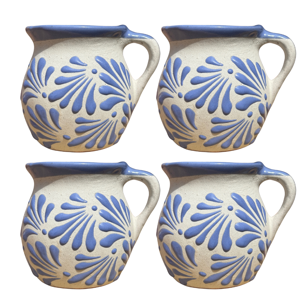Add a splash of vibrant charm to your coffee moments with this set of 4 white jarritos adorned with playful lilac espiga patterns. Handmade in Mexico, each piece brings a touch of artistry and tradition to your table while perfectly sized for your favorite brew. Brighten your mornings and share the fun with friends using these colorful, unique mugs!