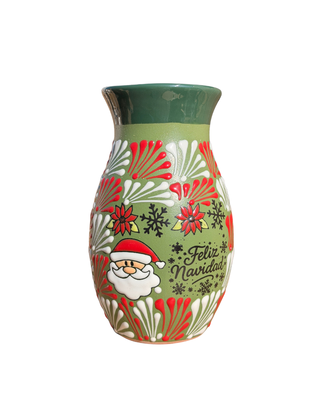 Bring festive magic into your home with this charming Mexican vase. Featuring a vibrant green base adorned with red and white details that form adorable Santa Claus, each piece tells a story of authentic craftsmanship. Handmade in Mexico with dedication and love, this vase is perfect for displaying fresh flowers or as a festive decoration that celebrates tradition and seasonal spirit. A touch of joy that transforms any space.