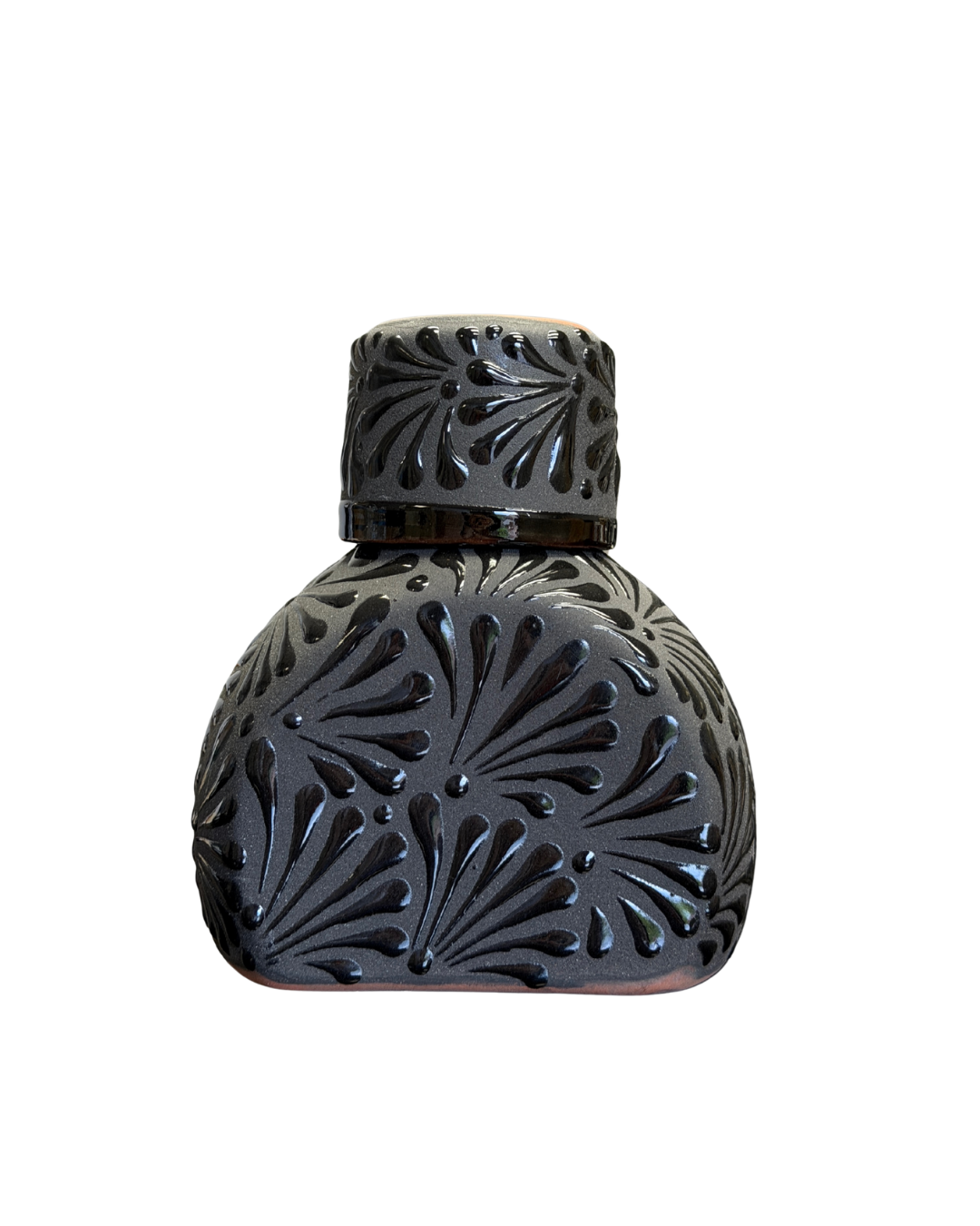Sacia tu sed con estilo usando esta hermosa Licorera hecha a mano, elaborada con orgullo en México. Su elegante diseño negro sobre negro aporta sofisticación moderna a cualquier espacio, ya sea en tu mesita de noche o luciendo en la mesa del comedor. Perfecta para mantener el agua fresca y a tu alcance, esta pieza artesanal combina funcionalidad con autenticidad. Cada licorera cuenta una historia de artesanía tradicional mexicana, convirtiéndose en un conversador tan cautivador como en un compañero práctico para tus necesidades diarias de hidratación.
